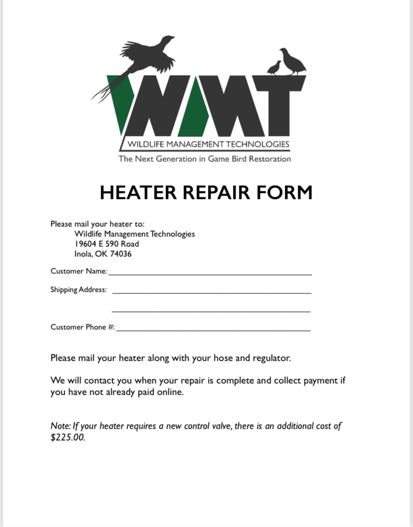 If you are in need of a heater repair, please add to your cart, complete and print the form found on this page and include with your heater return along with your heater, heater hose, and regulator. Missing parts or information will delay your heater repair and may incur additional cost to you. Most repairs completed within the same day.
